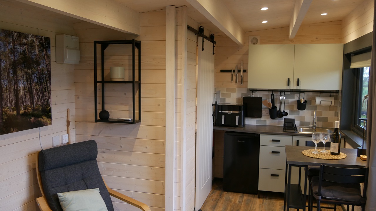 These thoughtfully designed cabins offer all the comforts of home in a compact and stylish space. Bumblebee cabin and Barn Owl cabin sit next to each other in a wooded area, separated by privacy fencing. The cabins are a short walk down a lit gravel path from the parking area. In each cabin you will find a comfortable double bed, a well-equipped kitchenette, an en-suite shower room, a cosy table with bar stools for meals, and comfy armchairs sitting next to a small coffee table.